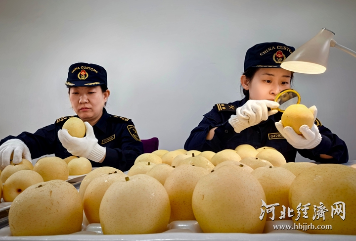 鹿泉海關(guān)關(guān)員檢驗出口鮮梨。郎鵬榮 攝