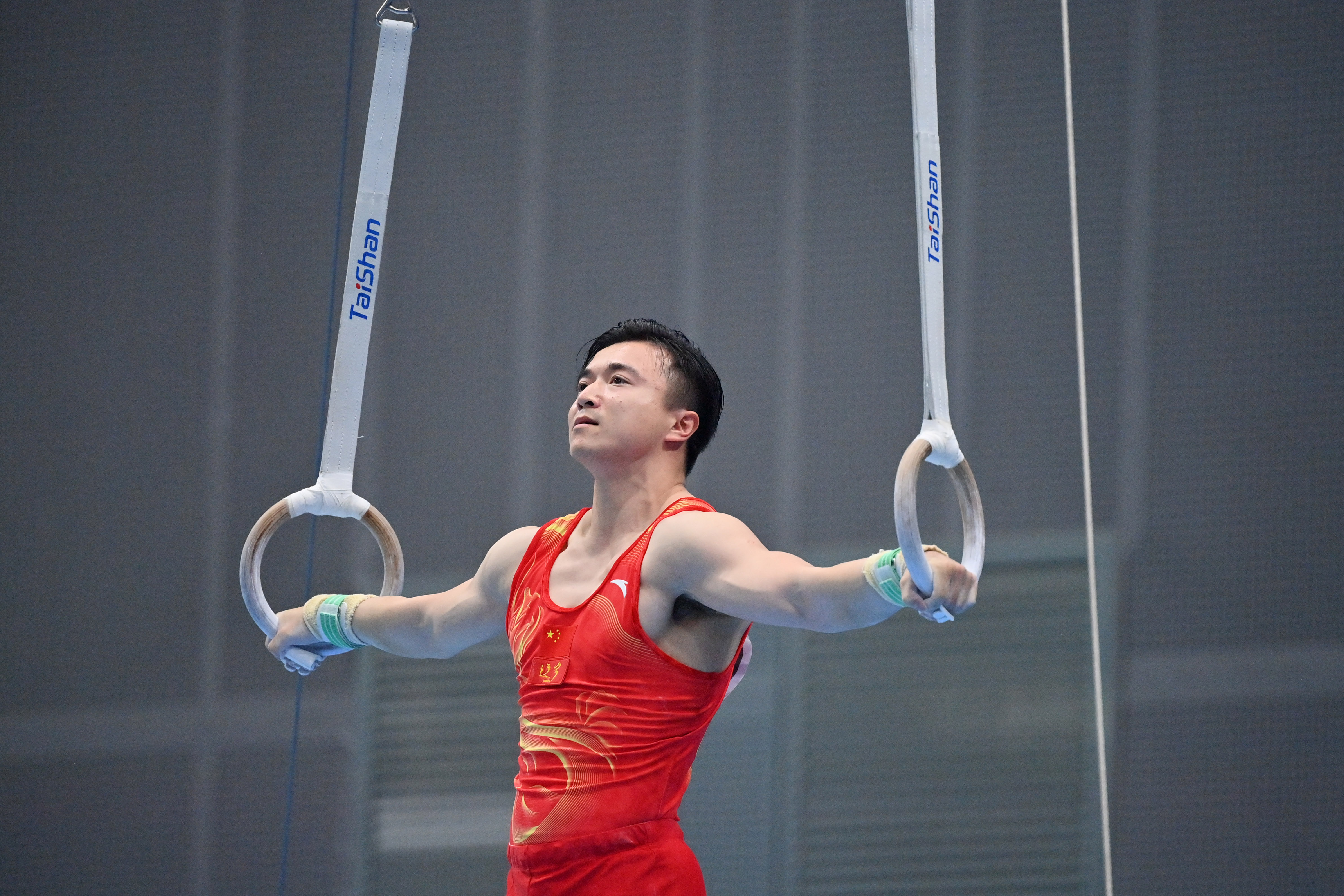 男子吊環(huán)決賽精彩紛呈。冠軍首先出場的全國廣西隊運動員蘭星宇憑借出色的發(fā)揮得到14.466分。江蘇隊老將尤浩依舊穩(wěn)健,落地干凈漂亮,以14.733分實現(xiàn)超越。