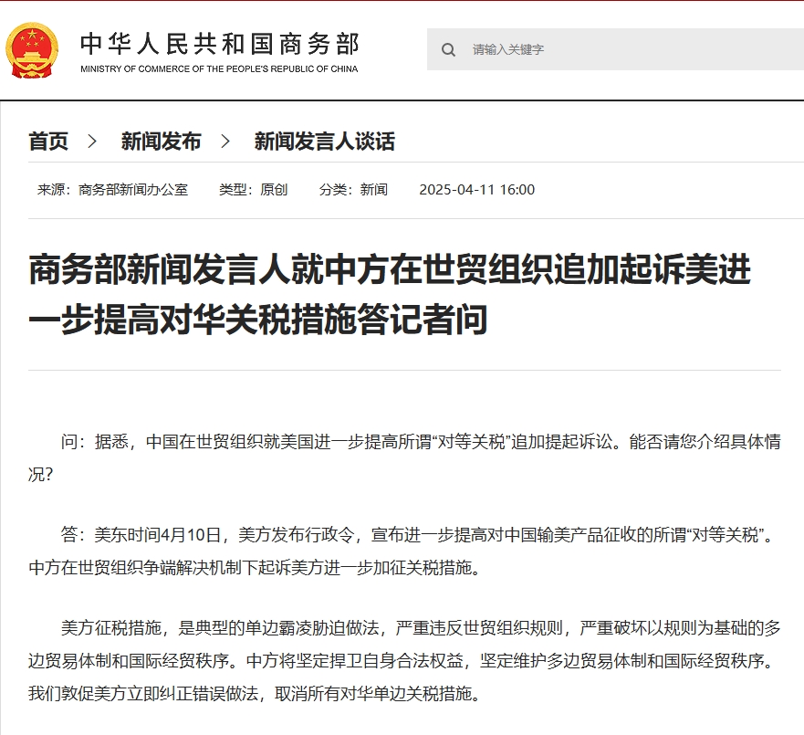 答:美東時(shí)間4月10日,美方發(fā)布行政令,言人宣布進(jìn)一步提高對(duì)中國輸美產(chǎn)品征收的中方組織追加所謂“對(duì)等關(guān)稅”。中方在世貿(mào)組織爭端解決機(jī)制下起訴美方進(jìn)一步加征關(guān)稅措施。起訴