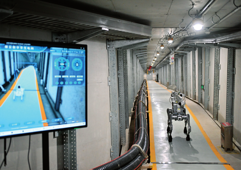 四足巡檢機(jī)器人在雄安新區(qū)雄東電纜 隧道內(nèi)巡檢(2025 年 4 月 15 日攝) 牟宇攝 / 本刊