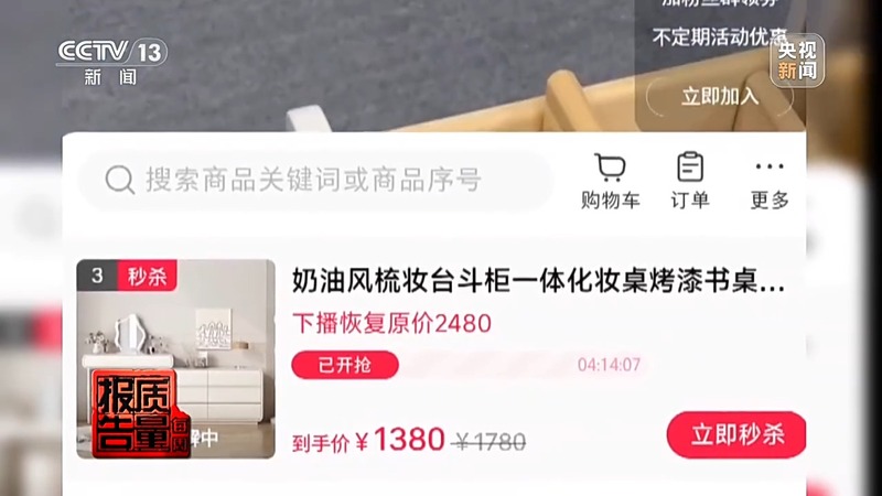 例如一個主營家具的直播間銷售的一款梳妝臺。據(jù)帶貨主播介紹,這款梳妝臺在直播間購買有優(yōu)惠,到手價1380元,另外在顯著位置用紅色字體標注“下播恢復(fù)原價2480”,按照這樣的折扣力度計算,相當于消費者可享受5.5折的優(yōu)惠。然而當記者仔細觀察時發(fā)現(xiàn),在“到手價1380”后有一個數(shù)字“1780”被劃掉了,這個被劃掉的價格用了不明顯的灰色小字標注,很容易被消費者漏掉。而按照這一劃線價來算,消費者實際享受的折扣僅為7.7折。