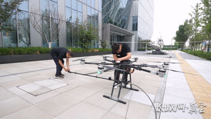 工作人員調(diào)試搭載智能清潔系統(tǒng)的無人機。長城網(wǎng)·冀云客戶端記者 張?zhí)旎?攝