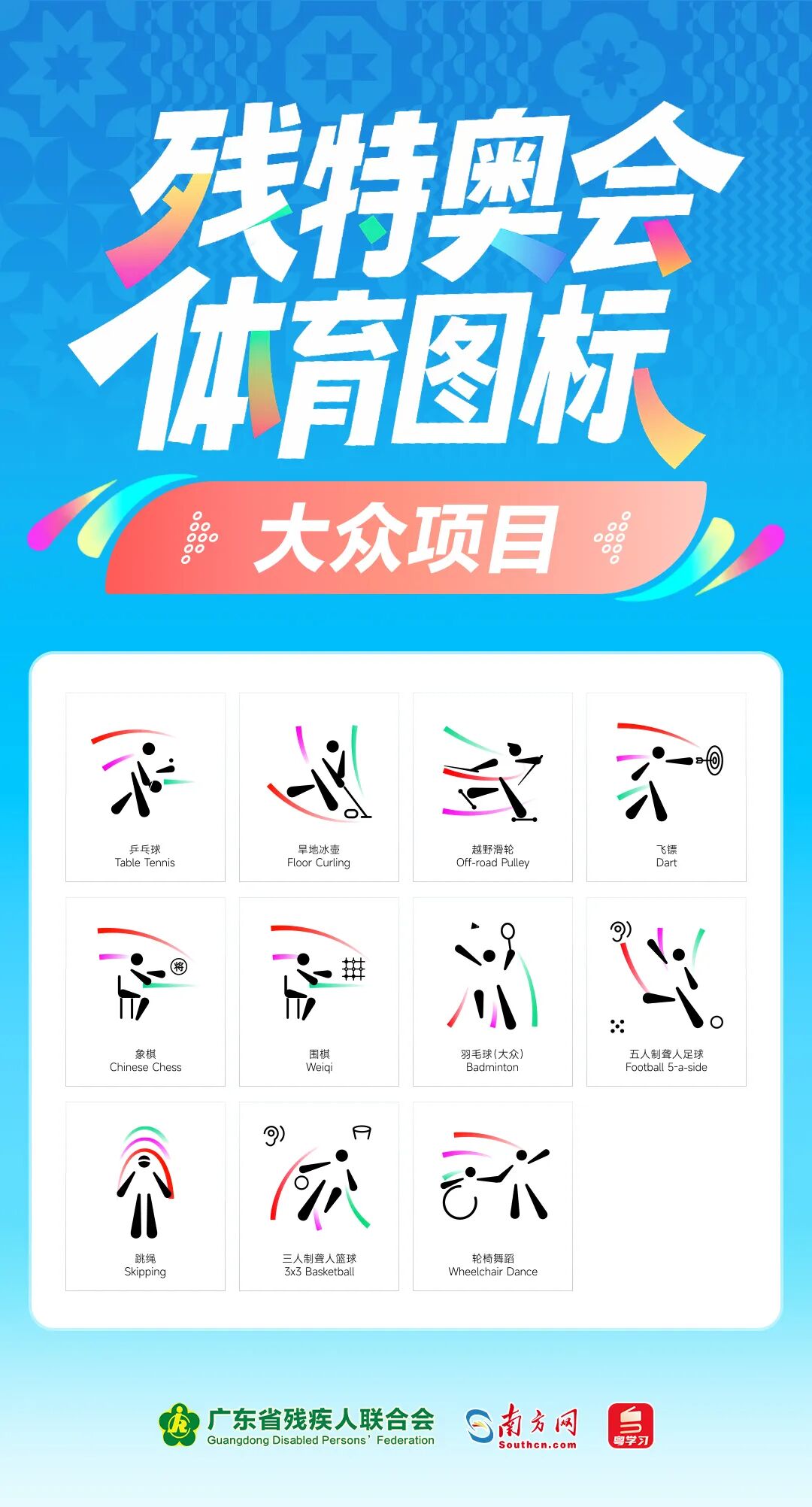 為賽事增添更多人文溫度與視覺(jué)亮點(diǎn)。使無(wú)形成為有形,以最少的元素表現(xiàn)出每個(gè)運(yùn)動(dòng)的精彩瞬間。綻放、突出“同心、本次展示的體育圖標(biāo)和運(yùn)動(dòng)造型與此前發(fā)布的十五運(yùn)會(huì)和殘?zhí)貖W會(huì)吉祥物、融合”的理念,體育圖標(biāo)和吉祥物運(yùn)動(dòng)造型設(shè)計(jì)既融合了大灣區(qū)的地域文化特色,更完整地展現(xiàn)了運(yùn)動(dòng)的過(guò)程和美的感受。又彰顯了殘?zhí)貖W會(huì)“平等、附加的三色彩帶是一個(gè)創(chuàng)新的表達(dá),取意禮花綻放,展現(xiàn)美好生活。
