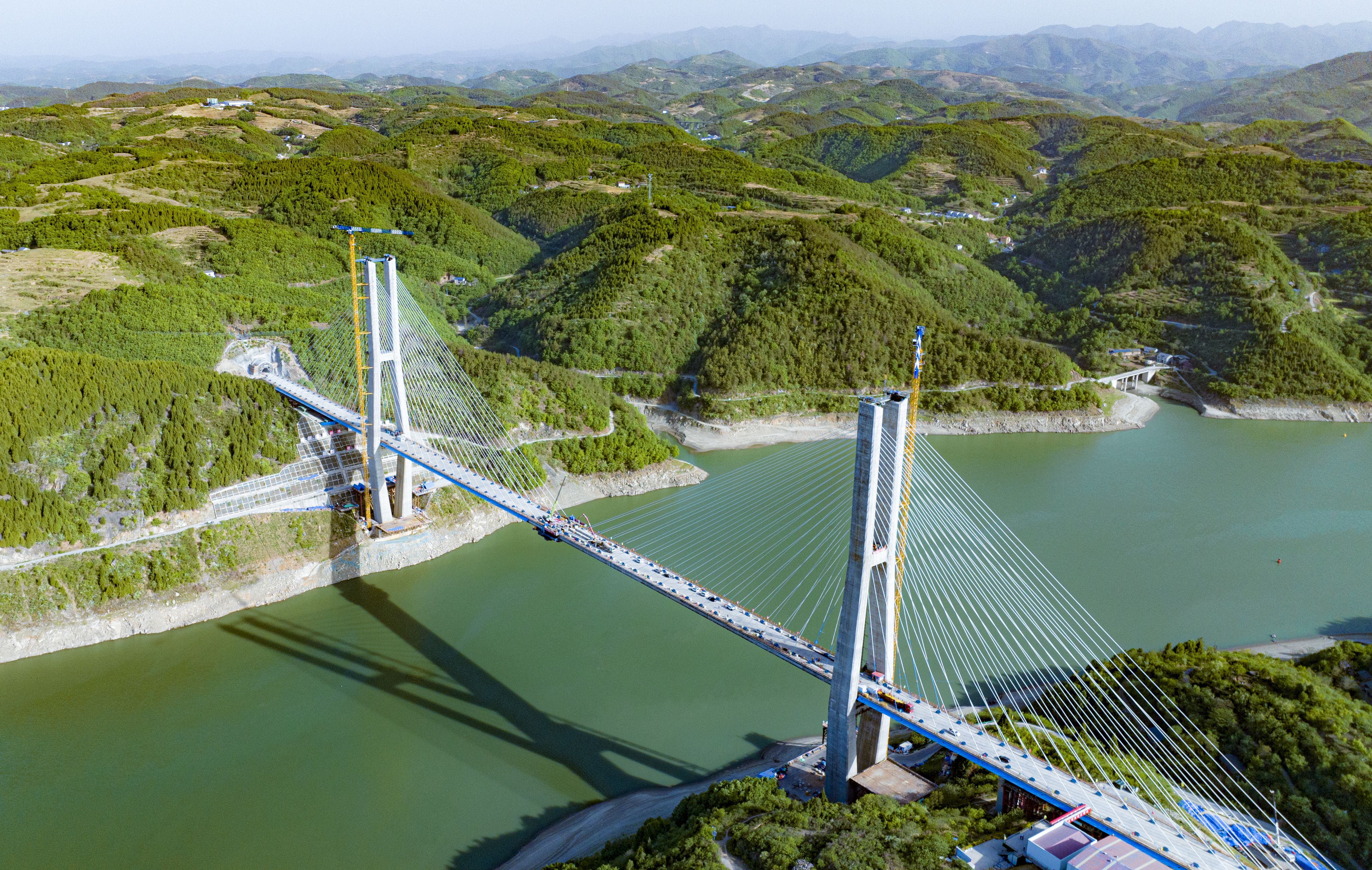 漢江特大橋位于湖北省十堰市鄖陽區(qū)境內(nèi),采用空間雙索面體系呈扇形布置。建設(shè)者先完成混凝土主梁的施工,西安至十堰將實現(xiàn)1小時內(nèi)到達(dá),