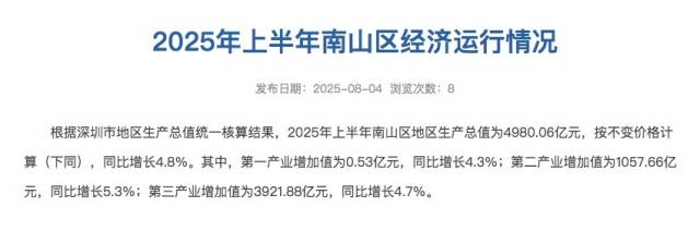 8月4日,半年其中,數(shù)據(jù)按不變價(jià)格計(jì)算(下同),出爐深圳市南山區(qū)統(tǒng)計(jì)局發(fā)布2025年上半年南山區(qū)經(jīng)濟(jì)運(yùn)行情況: