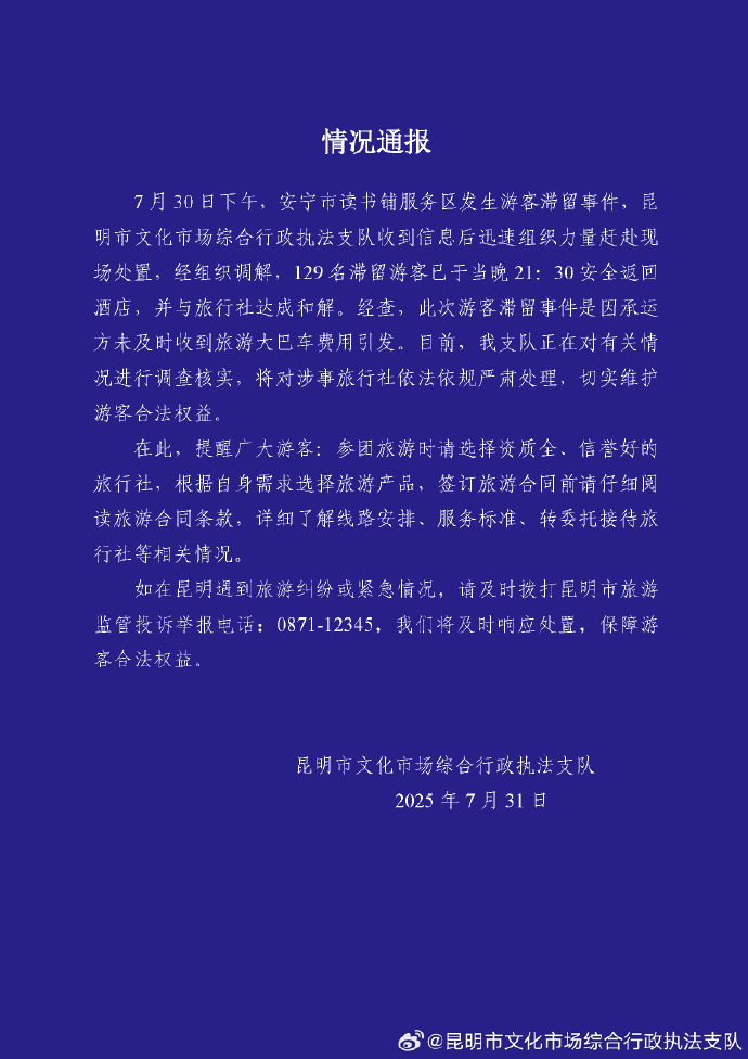 目前,昆明客滯此次游客滯留事件是通報(bào)因承運(yùn)方未及時(shí)收到旅游大巴車費(fèi)用引發(fā)。并與旅行社達(dá)成和解。名游129名滯留游客已于當(dāng)晚21:30安全返回酒店,留服旅行理