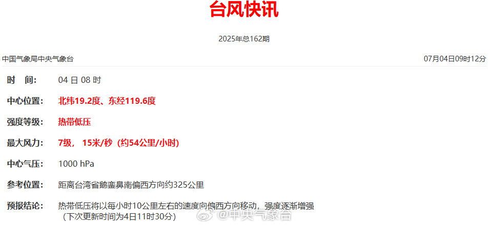 局部暴雨,33~38米/秒),據(jù)中央氣象臺消息,5日午后將轉(zhuǎn)向偏北方向移動,沿海地區(qū)的朋友們要關(guān)注這個熱帶低壓未來的動向。南海熱帶低壓生成,受輻合帶北抬影響,